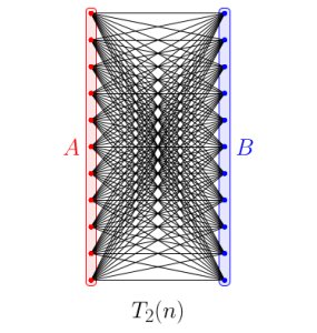 Extremal graph theory concerns itself with how big or small a graph can be, given that it satisfies certain restrictions. Perhaps the first theorem in this area is due to W. Mantel from 1907, concerning triangles in graphs. A triangle is what you expect it to be: three vertices $x,y,z$ such that every pair $x,y$ and $y,z$ and $z,x$ is an edge. Consider a graph which has some number $n$ of vertices, and these are split into two sets $A$ and $B$ of size $\lfloor n/2\rfloor$, $\lceil n/2\rceil$ respectively. Now add every edge with one vertex in $A$ and one vertex in $B$. This graph, which we call $T_2(n)$, has $|A||B|=\lfloor n^2/4\rfloor$ edges. Also, it does not contain any triangles, because at least two of its vertices would have to both lie in $A$ or in $B$, and there is no edge between such pairs. Mantel proved that if any graph other than $T_2(n)$ has $n$ vertices and at least $\lfloor n^2/4\rfloor$ edges, it must contain a triangle. In other words, $T_2(n)$ is the unique `largest' triangle-free graph on $n$ vertices.
