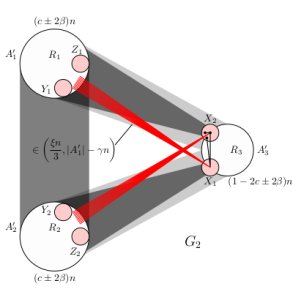 The remaining piece of the puzzle was to obtain an exact (rather than asymptotic) solution. In recent work with Hong Liu and Oleg Pikhurko at the University of Warwick, I addressed a conjecture of Lovász and Simonovits, the solution of which would answer Erdős's question in a strong form. The conjecture put forward a certain family of $n$-vertex, $e$-edge graphs which are extremal, in the sense that they should each contain the fewest triangles. So in general there is more than one such graph, one aspect which makes the problem hard. Building on ideas of Razborov and Pikhurko-Razborov, we were able to solve the conjecture whenever $e/\binom{n}{2}$ is bounded away from $1$; in other words, as long as $e$ is not too close to its maximum possible value $\binom{n}{2}$.