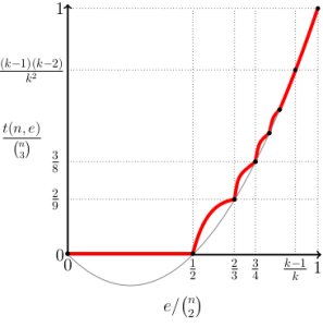 Astoundingly, this seemingly simple question has yet to be fully resolved, 60 years later. Still, in every intervening decade, progress has been made, by Erdős, Goodman, Moon-Moser, Nordhaus-Stewart, Bollobás, Lovász-Simonovits, Fisher and others. Finally, in 2008, Russian mathematician A. Razborov managed to solve the problem asymptotically (meaning to find an approximation $g(e/\binom{n}{2})$ to $t(n,e)$ which is arbitrarily accurate as $n$ gets larger). Razborov showed that, for large $n$, $g(e/\binom{n}{2})$ has a scalloped shape: it is concave between the special points $\frac{1}{2}\binom{n}{2}, \frac{2}{3}\binom{n}{2}, \frac{3}{4}\binom{n}{2}, \ldots$. His solution required him to develop the new method of flag algebras, part of the emerging area of graph limits, which has led to the solution of many longstanding problems in extremal combinatorics.