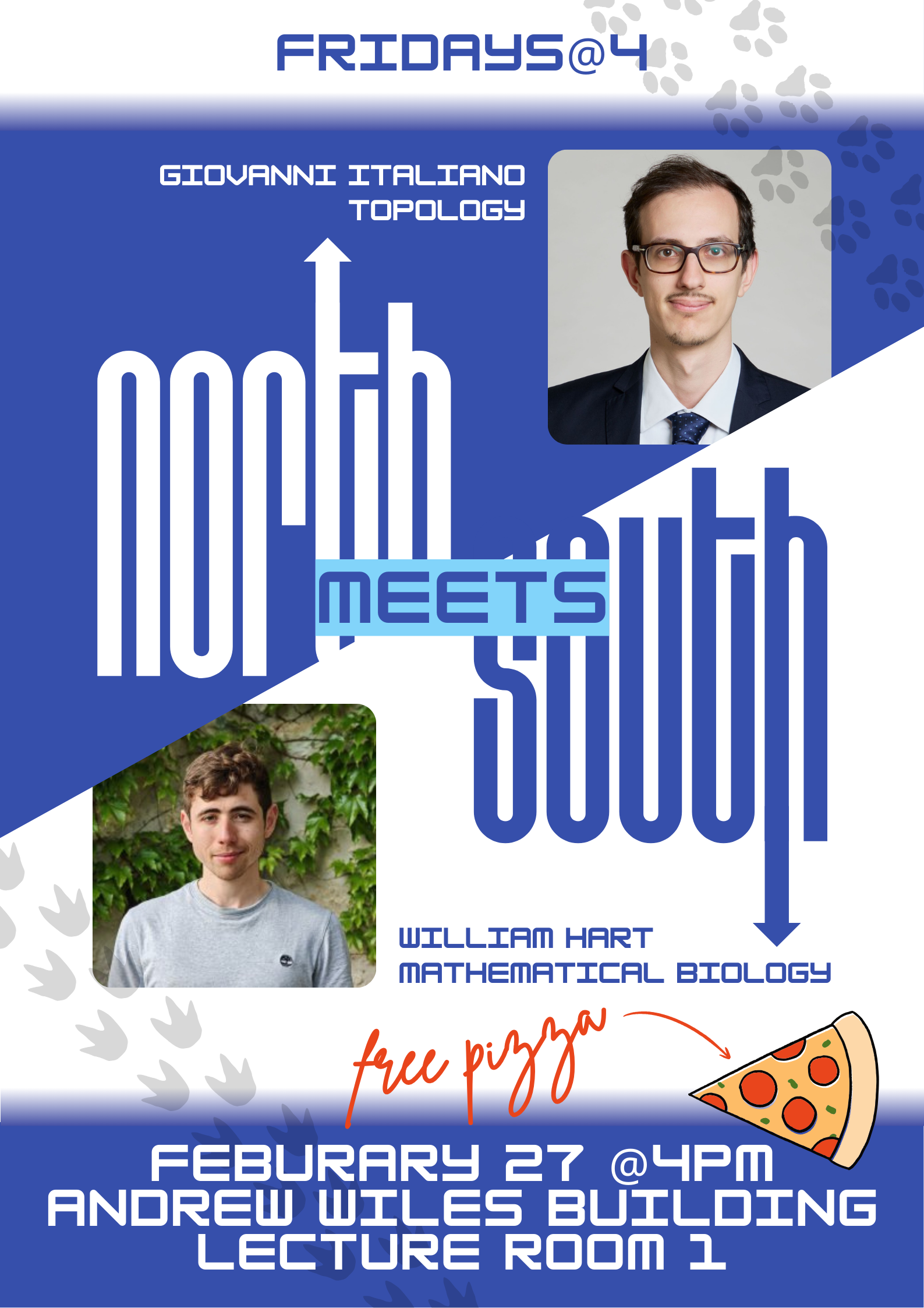 North meets South is a tradition founded by and for early-career researchers. One speaker from the North of the Andrew Wiles Building and one speaker from the South each present an idea from their work in an accessible yet intriguing way.
