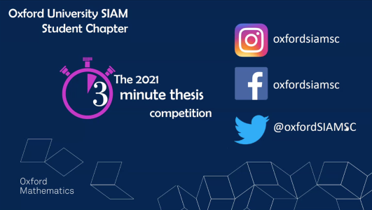 The Oxford University Society for Industrial and Applied Mathematics Student Chapter 3 Minute Thesis Competition saw 10 of our postgraduates present their latest research to a panel of our judges. Topics included Langland's Grand Unified Theory; Quantum irreversibility; and using magnets and maths to deliver stem cell therapy.