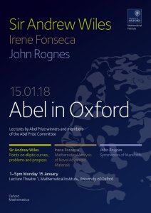 The Abel Prize is the most prestigious prize in Mathematics. Each year, in anticipation of the prize announcement, an afternnon of lectues showcases previous winners and member of the Committee. This year the event will be held in Oxford on Monday 15th January. Andrew Wiles, John Rognes and Irene Fonseca will be the speakers. Full details below. Everyone welcome. No need to register.