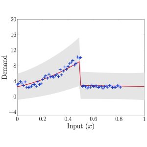 Having conducted a number of numerical experiments, our results are rather promising: the method compares favourably with state of the art methods when repeating experiments from recent literature. The added benefit, though, is that when these experiments are modified to have weaker assumptions on how the test data should look and be generated, our method maintains its strong performance better than its competitors. Our modifications included diversifying the shape of demand curve on which the methods were tested, as well as allowing for the presence of changepoints - points at which the characteristics of the underlying demand trend change dramatically. Using existing theory, we can elegantly extend our GP regression framework to cope with such situations by constructing an appropriate covariance function. For our purposes, we want to allow for the fact that the covariance before and after the changepoint might be completely different. We therefore redefine our covariance function to be \begin{align}\label{eq: Changepoint covariance} k(x,x') = \begin{cases} \sigma_1^2(x^\top x' + c_1)^{p_1} & \text{if } x,x' < x_c,\\ \sigma_2^2(x^\top x' + c_2)^{p_2} & \text{if } x,x' \geq x_c,\\ 0 & \text{otherwise}, \end{cases} \end{align} where $\theta = \{\sigma_1, \sigma_2, c_1, c_2, p_1, p_2, x_c\}$ are all hyperparameters inferred from the data. You can see an example of how well it performs in the image below."