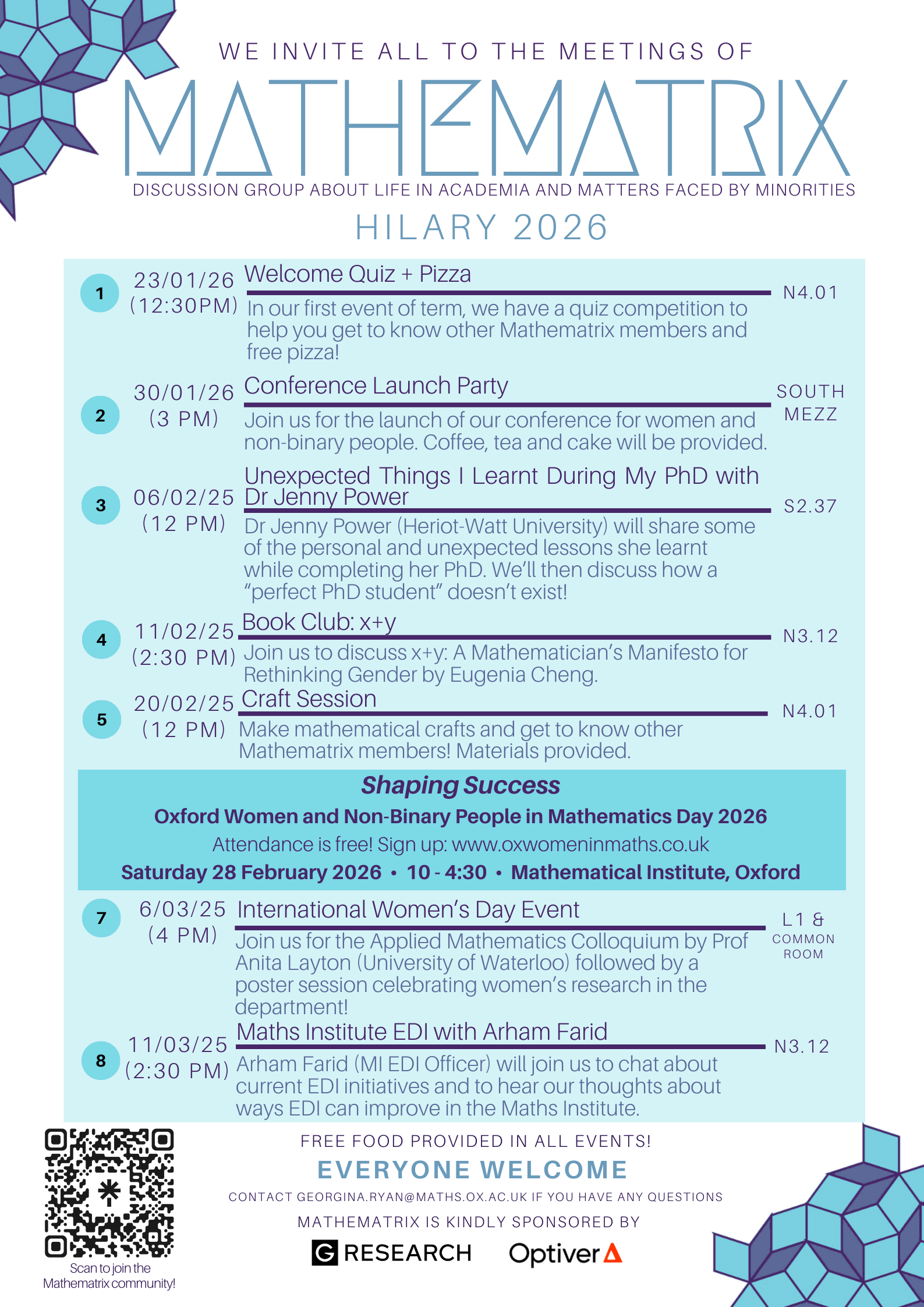 We are also actively looking for individuals interested in helping with the organisation of Mathematrix and/or the Oxford Women and Nonbinary People in Maths Day (co-run with the undergraduate Mirzakhani Society). If you are interested in getting involved behind the scenes, please email @email.