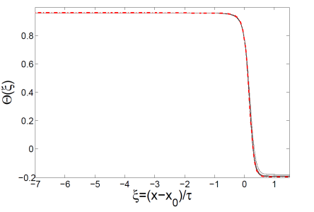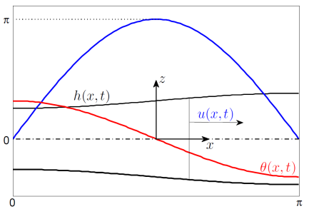 Figure 2: Typical profiles of the height (black), velocity (blue) and temperature (red) for a free liquid sheet