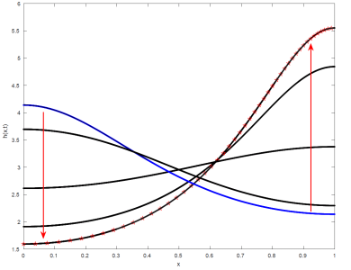 Figure 5: Convergence to non-homogeneous stationary height profiles of free viscous liquid sheets in the absence of surface tension.