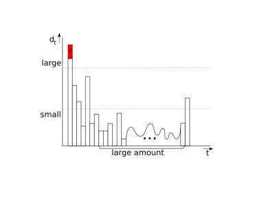 * Secondly, we discover many small values $d_t$ exactly. We use these to either reconstruct the entire degree sequence (then we can read off the number of edges from this) or discover some large values. Suppose that we find a segment as in the picture below: one large value, and to one side of it a bunch of known values, many of which are small. We "match up'' the known values to various shifts of $(\widetilde{d}_t).$ For the correct shift, the error will be small, whereas for any other shift the error is lower bounded by the difference between large and small in the figure below. This allows us to recover $\alpha$ and then the number of edges.