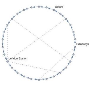 Indeed, by supervising Masters level projects in this area, most recently for the Oxford MMSC course, a big question that has been addressed is, 'what is the optimal railway network?' Starting with an abstraction of the railway network, then strategically adding nodes and edges, it turns out that a one-way ring layout is best! Whilst this allows stations to wait only for one train before departures, it obviously looks impractical; for instance, to travel from London Euston to Oxford, it seems one would have to go through Edinburgh! But actually the additional nodes in this layout represent platforms within stations, and the dashed edges represent walks between these platforms. This is what produces the impracticality illusion; we have in fact split London Euston into multiple substations, i.e., platforms. So MPA allows a lot of room for manoeuvre to produce optimal railway networks. This work has also thrown up a multitude of interesting theoretical questions, such as the concepts of eigenvalues and eigenvectors in generalised models; so this is a classic example of a two-way benefit: pure mathematics feeds applied mathematics, which feeds back to pure.