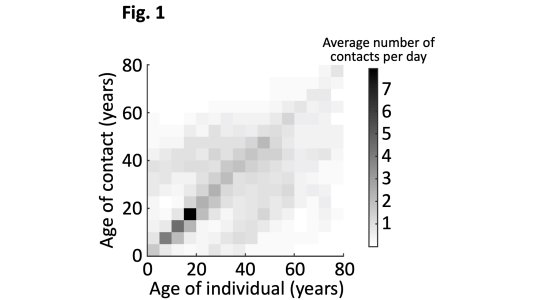 Fig 1 (above): the transmission risk depends on the frequency of contacts between individuals and the transmission probability per infected-susceptible contact. This graph shows the average number of daily contacts between an individual in the age group on the x-axis and a contact in the age group on the y-axis, in the UK under normal circumstances (data from Prem et al. PLoS Comp Biol 13: e1005697, 2017). Figure generated by Francesca Lovell-Read (DPhil student in Oxford Mathematics' Wolfson Centre for Mathematical Biology).