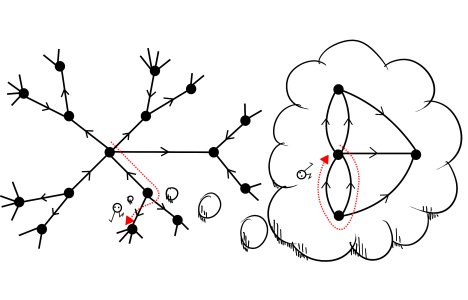 Here is a picture of two wanderers living on two graphs with the same universal cover, imagining that they are living on a common cover: