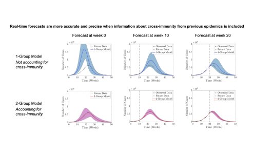 In the scenario that was considered for an epidemic occurring 25 years into the future, the 1-group model only produced accurate outbreak forecasts once the peak of the epidemic had passed, while the 2-group model made accurate forecasts early on (Fig. 2). Based on these results, the team conclude that accounting for cross-immunity, driven by exposure to previous epidemics, improves the accuracy of forecasts during influenza outbreaks. These findings could also be applied to the ongoing coronavirus pandemic, where incorporating information about cross-immunity between strains into models could result in better predictions about the spread of the virus.