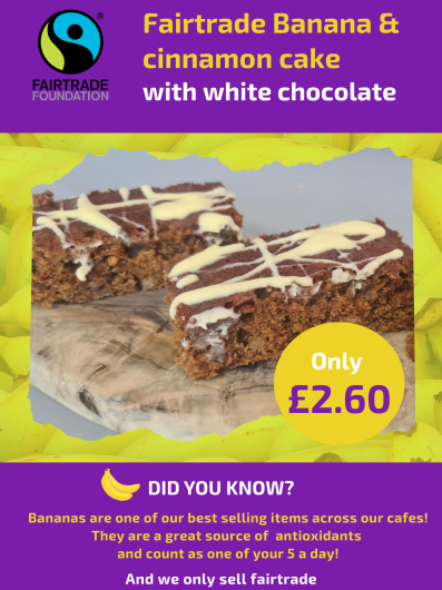 Special Fairtrade Treat - Banana & Cinnamon Cake with White Chocolate, made in-house by our chefs with Fairtrade bananas, available across all our outlets for only £2.60.