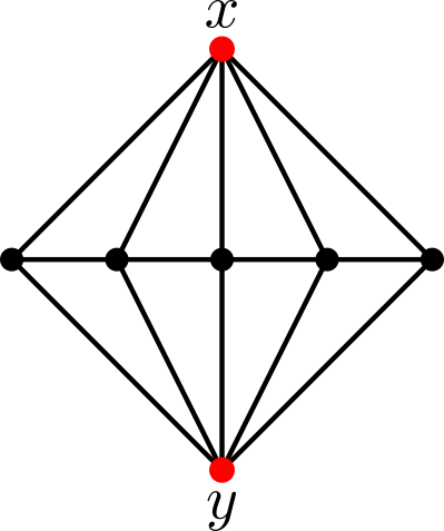 ![]() join of the graph on vertices $\{x,y\}$ and the path of length $4$. | ![]() (see Definition 2 below): the join of the red subgraph and the blue subgraph $\{x, y\}$ is a maximal reducible subgraph whose flag complex is not simply connected. |