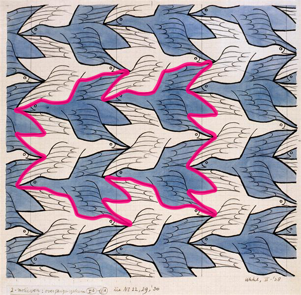 The original pictorial representations of the Euclidean plane and the hyperbolic disc are due to the Dutch artist M. C. Escher. These images are publicly available on wikiart.org under the Fair Use licence . The title of the works are (from left to right) Two Birds and Circle Limit IV (Heaven and Hell). These modifications were made by the author with nonprofit educational purposes.