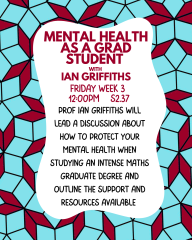 On Friday October 31st at 12 pm in S2.37, Mathematrix is hosting a discussion with Ian Griffiths (one of our mental health first aider) about how to protect your mental health while studying an intense graduate degree at Oxford.
