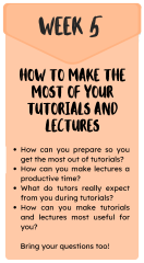 Week 5's session, How to Make the Most of your Tutorials and Lectures, will look at how to prepare effectively, make lectures more productive, and understand what tutors expect from you during tutorials. You’ll leave with practical tips to help you study more confidently and make your learning time count.