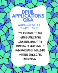 Join us in N3.12 at 2:30 pm on Wednesday December 3rd for a chance to ask Mathematrix DPhil students anything you are wondering about the experience of applying for a maths PhD. There will be sweet treats as always.