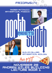 North meets South starring:Andrea Antinucci (Mathematical Physics, North)Guilia Cellora (Mathematical Biology, South)4 pm today, L1. Images Bulletin category Events in the Department Weight -2