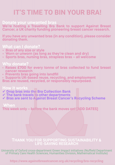 The scheme, run by Against Breast Cancer and supported by the University, takes your unwanted or unloved bras and via their textile recovery project gives them a new lease of life. raising funds for their research.