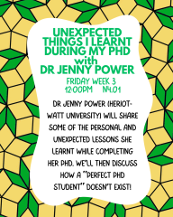 Join us on Friday 6th Feb from 12-1 pm to hear Dr Jenny Power (Heriot-Watt University) share some of the personal and unexpected lessons she learnt while completing her PhD. We’ll then discuss how a “perfect PhD student” doesn’t exist. There will be a free sandwich lunch as always.