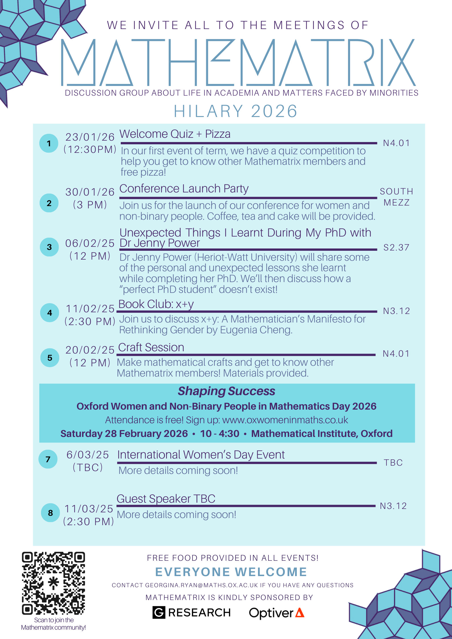 We are also actively looking for individuals interested in helping with the organisation of Mathematrix and/or the Oxford Women and Nonbinary People in Maths Day (co-run with the undergraduate Mirzakhani Society). If you are interested in getting involved behind the scenes, please email @email.